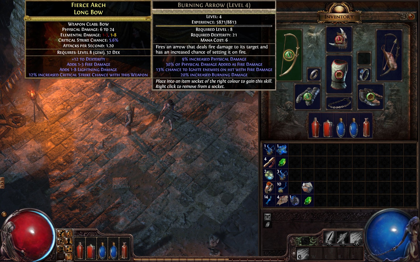 Para añadir otra vuelta de tuerca al sistema, los objetos también pueden incluir huecos para incrustar gemas de habilidades de soporte. Estas gemas modifican el comportamiento de la habilidad principal que tengamos incrustada en ese arma. Por ejemplo podemos tener incrustada en un arma una gema de bola de fuego y añadirle después una gema pasiva que añada otro proyectil. Con lo que al usar la habilidad lanzaremos 2 bolas de fuego en lugar de una.
