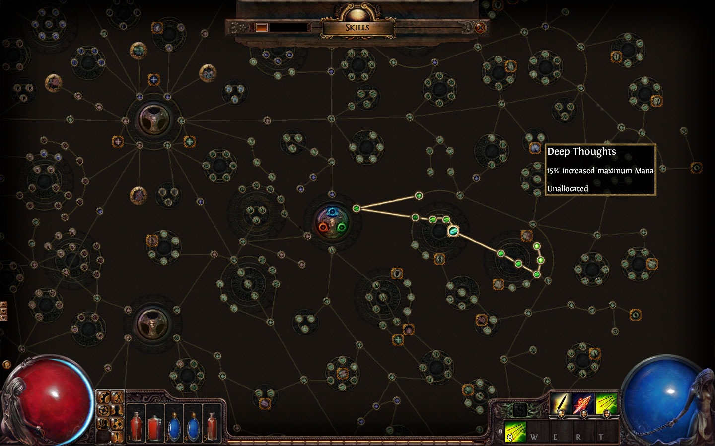 Primero esta el sistema de pociones. Tendremos una barra con 5 accesos directos para pociones. En estos huecos podremos equipar 5 frascos de pociones, de mana o de salud, que se rellenan automáticamente según matemos monstruos. Además existen muchos tipos de frascos, normales o con propiedades mágicas y que nos darán algunos beneficios extra aparte de la regeneración de salud. Con esto han conseguido que los frascos de pociones sean otro tipo de objetos que podamos buscar y mejorar. Para mi gusto uno de los grandes aciertos del juego.
