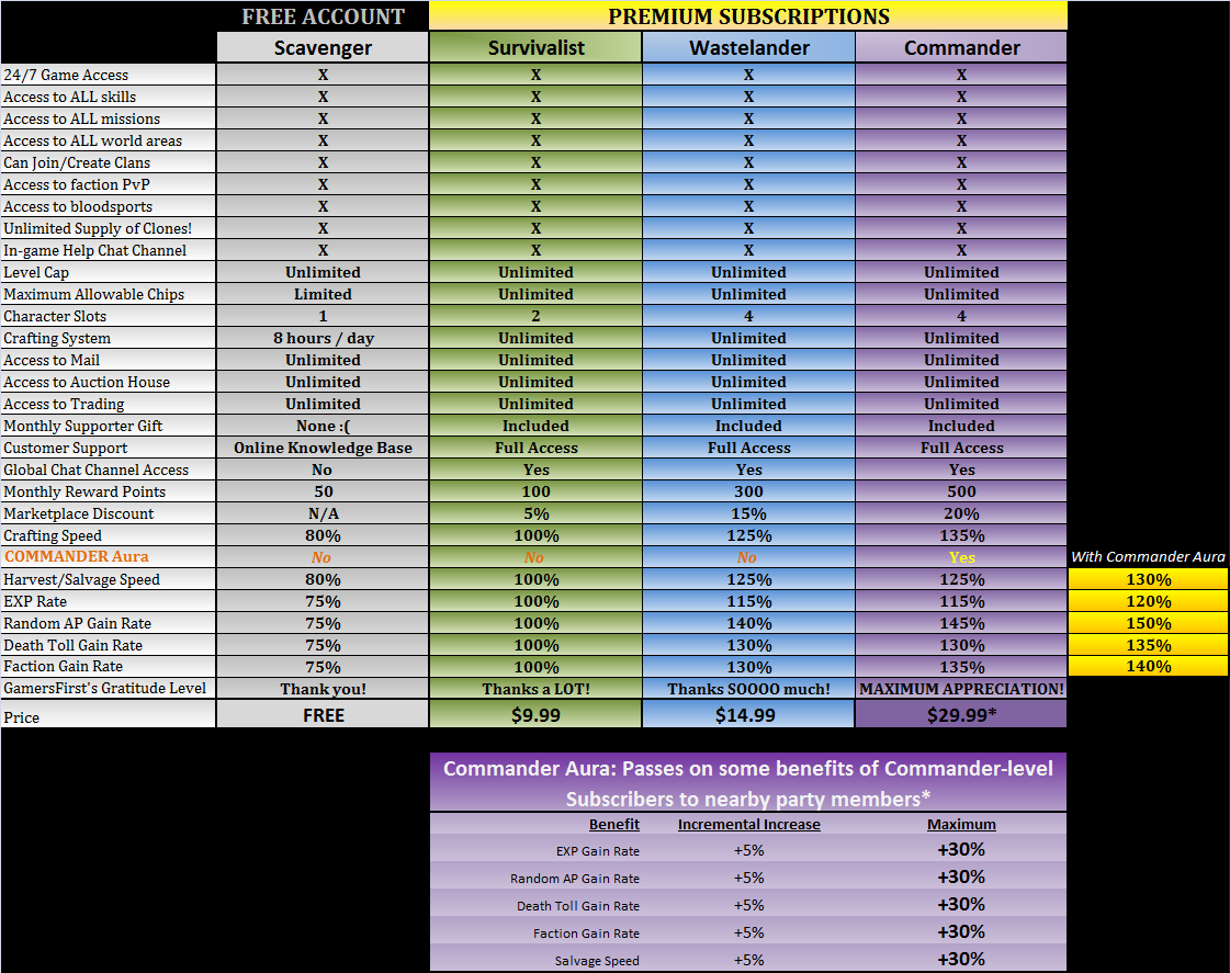 En este aspecto Fallen Earth nos ha sorprendido con sus opciones de suscripción y el juego contara con 4 tipos de usuarios. Los usuarios gratuitos, que tendrán algunas limitaciones en cuanto a huecos para personajes y la velocidad en la que ganaran puntos, aunque tendrán acceso a todas las misiones, habilidades y todas las zonas. Y luego existen 3 opciones de suscripción mensual desde los 9.99$ hasta los 29.99$.
