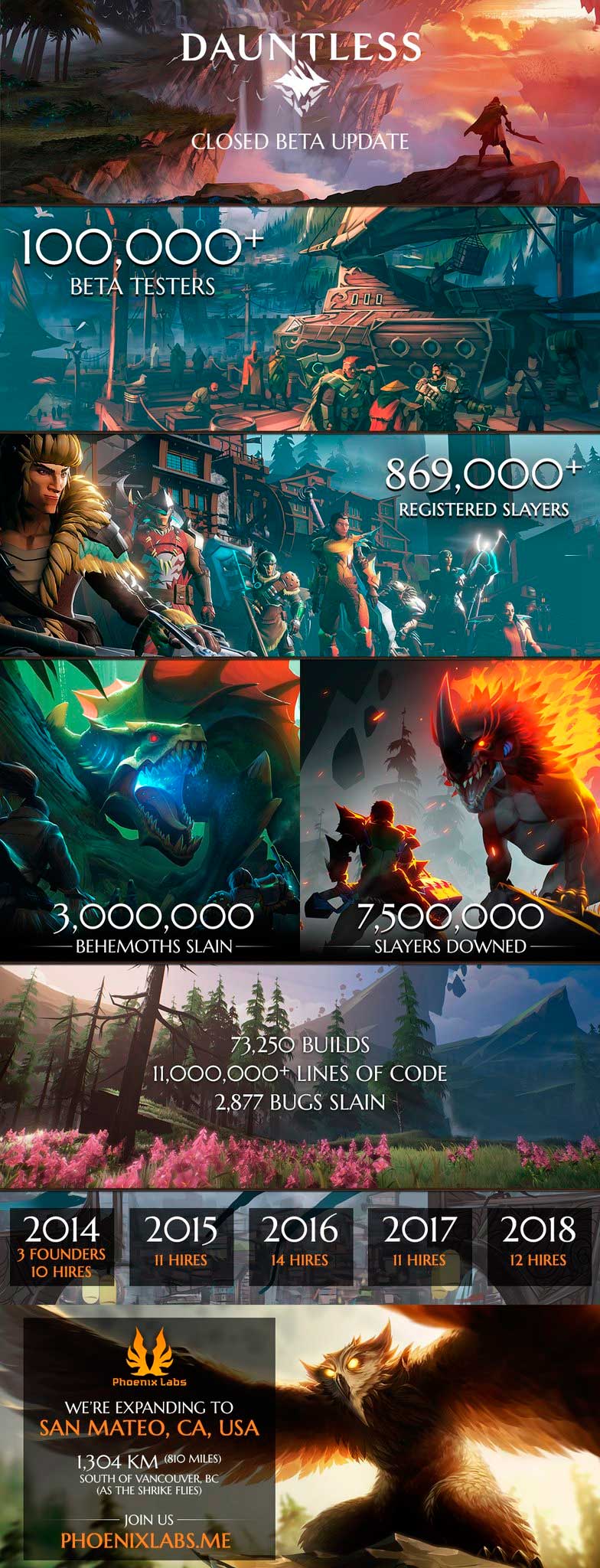 También han presentado una interesante infografía que podéis ver al final de la noticia. Más de 869.000 jugadores se han interesado en probar la beta de Dauntless mientras que son mas de 100.000 los que han adquirido algún pack y están probando el juego. Phoenix Labs ha tenido un crecimiento constante desde que en 2014 era un pequeño estudio formado por 8 personas hasta contar hoy en día con una plantilla de 52 empleados a tiempo completo.