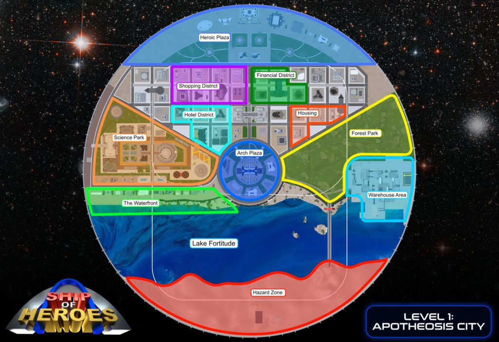 Hoy hemos podido ver en Massively OP el primer mapa de Ship of Heroes. La área de inicio de todos los héroes se llamará Apotheosis City y tiene un montón de distritos diferentes. Aunque no hay más que un mapa en 2D, se intuye que será un mapa grande.