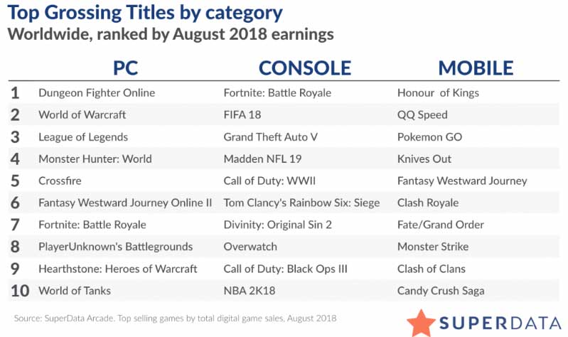 El lanzamiento de la nueva expansión, “Battle of Azeroth”, sería lo que habría impulsado a WoW a este puesto con unos ingresos de 161 millones de dólares. WoW habría alcanzado una cuota de suscriptores que no tenía desde 2014.