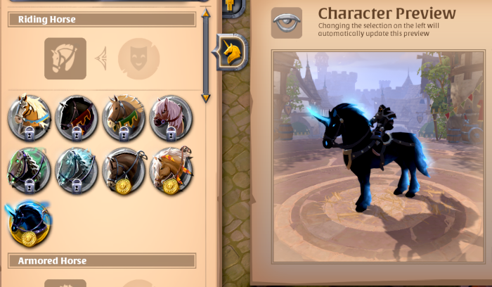 Percival trae un nuevo sistema de personalización y vanidad para el mundo de Albion, permitiéndote exhibir tu personalidad con decenas de opciones de pelo, barbas, caras e incluso ropas intimas. Las skins de monturas te permiten desbloquear permanentemente opciones de apariencia para todos los personajes de tu cuenta, y cubren una amplia variedad de monturas estándar y exóticas. Además de las opciones gratuitas, también podrás usar Oro para desbloquear opciones de personalización adicionales para realmente distinguir tu personaje y montura de la multitud!