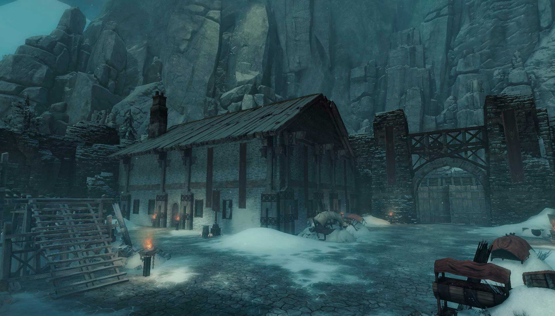 Ya en el nuevo capítulo, una vez amaine la tormenta, reanudaremos la búsqueda adentrándonos en el nuevo mapa, la Marca de Bjora. Se trata de un escenario radicalmente distinto al que nos ofrecía el valle de Grothmar. En este caso los parajes serán inhóspitos, las temperaturas gélidas y la atmósfera opresiva. Los diseñadores han puesto mucho énfasis en resaltar este último aspecto: la visibilidad, las condiciones ambientales en determinadas zonas, el sonido (incluyendo una misteriosa voz que nos susurra periódicamente), el metaevento de zona (en el que un temible enemigo avanza lenta pero inexorablemente hacia nuestro refugio), incluso la ausencia de puntos de ruta contribuyen a trasladar una sensación de vulnerabilidad y desamparo.