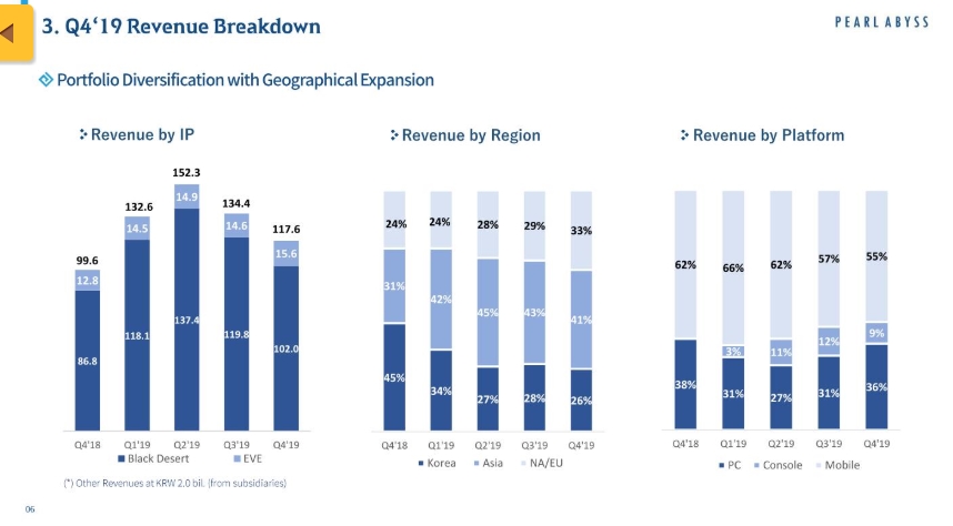 Black Desert y EVE Online, por ejemplo, aumentaron sus ganancias un 15 y 13% respectivamente respecto al mismo periodo en 2018. Eso sí, la compañía ha bajado un 11% en sus ingresos respecto al 3er trimestre de 2019.