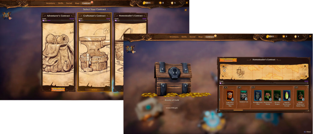 Los contratos son una forma de que los jugadores ganen y acumulen botín a través de la obtención de la Fama. Derrotando a desafiantes monstruos de varios tipos así como en algunas misiones ganarás Fama. Con tres (Aventurero, Artesano y Propietario) Contratos completos llenos de botín, incluyendo mascotas, recursos, recetas, decoraciones de fuertes, ranuras para personajes adicionales, pestañas de alijo y más, los jugadores tendrán mucho más contenido que ganar y recoger.