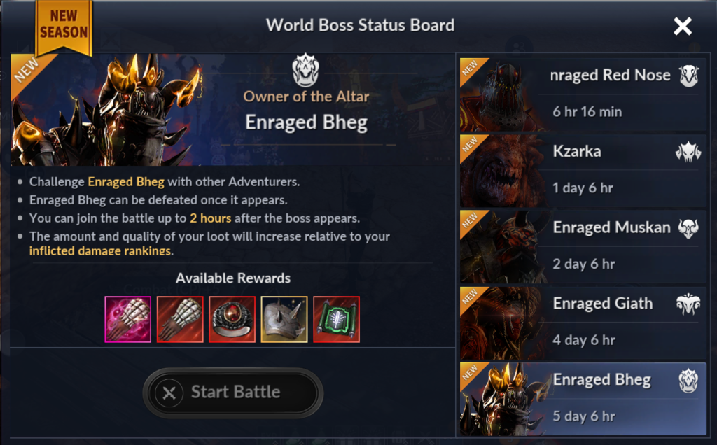 Para ayudar a los Aventureros a fortalecerse lo suficiente como para entrar al Reino de Hadum, se ha iniciado la tercera temporada de Jefes de Mundo; ahora los Jefes han sido renovados con nuevas y más poderosas recompensas, de manera que ahora los Aventureros podrán obtener fragmentos de equipamiento de Jefe y más probabilidad de conseguir sus armas y armaduras de alto grado.