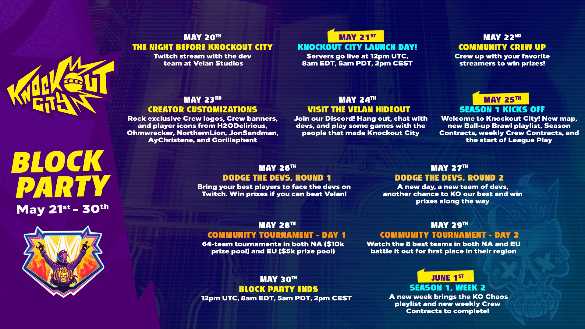 Knockout City, el título de Velan Studios inspirado en el balón prisionero, ofrecerá el el 21 de mayo una Fiesta Privada en el videojuego, un evento gratuito al estilo de un festival que ofrecerá 10 días seguidos de contenido para festejar sin parar, desde el 21 de mayo a las 14:00 hasta el 30 de mayo a las 14:00. EA y Velan darán la bienvenida a todos los jugadores, sin importar la plataforma, para que se unan y luchen por el dominio de Knockout City sin coste alguno durante 10 días a partir del lanzamiento.