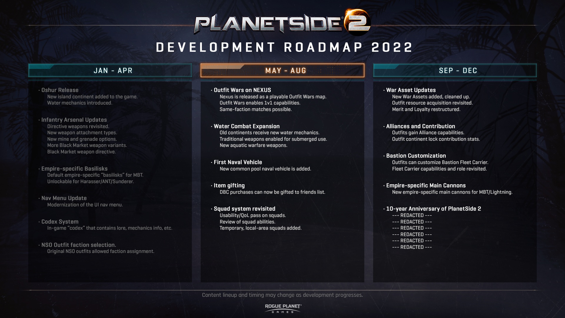 Daybreak nos trae una hoja de ruta actualizada con los contenidos nuevos que llegarán a PlanetSide 2 durante lo que queda de 2022. Una hoja de ruta dicen “ambiciosa! con mucho nuevo contenido.