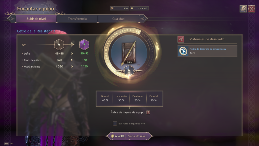 El equipo morado requiere más cuidado, ya que te acompañará durante un mayor número de horas. Por ello, es importante que elijas con atención qué equipamiento deseas mejorar.