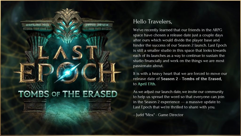 Los seguidores de Last Epoch, el popular RPG de acción desarrollado por Eleventh Hour Games, tendrán que esperar un poco más para disfrutar de su esperada temporada 2. Originalmente programada para el 2 de abril, la fecha de lanzamiento ha sido pospuesta al 17 de abril debido a la presión ejercida por el anuncio de nuevo contenido de un competidor que, aunque no se menciona directamente, apunta claramente a Path of Exile 2. Este último, desarrollado por Grinding Gear Games, reveló que su próxima actualización llegaría el 4 de abril, apenas dos días después de la fecha inicial de Last Epoch.