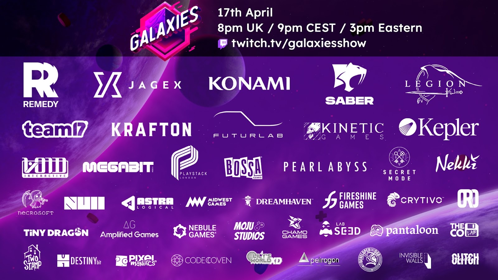 El primer showcase de videojuegos Galaxies ha revelado su impresionante lista de participantes, que incluye a reconocidos desarrolladores como Jagex, Remedy y Legion Studio. Este evento, que se transmitirá en exclusiva por Twitch el 17 de abril, promete ser un escaparate de innovaciones en el mundo del gaming, con más de 40 socios confirmados y varias primicias mundiales.