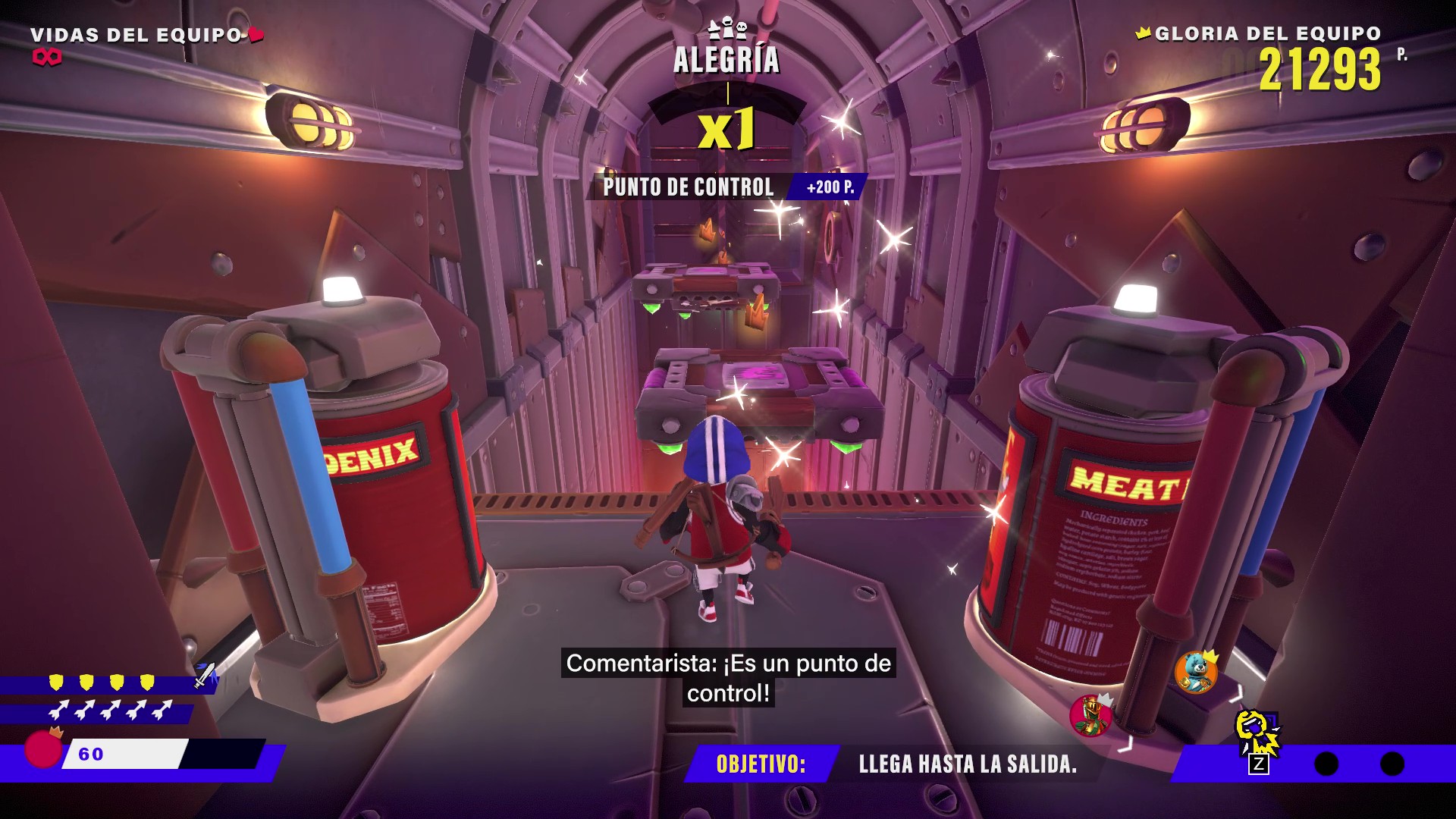 Uno de los mayores aciertos de King of Meat es su humor, un sello distintivo que impregna cada aspecto del juego. Desde los diálogos hilarantes hasta los personajes extravagantes que pueblan este universo, el título abraza un tono alocado y sin pretensiones que recuerda a shows de televisión extremos. La voz en off de un presentador omnipresente, que comenta con sorna nuestros aciertos y tropiezos, refuerza esta atmósfera de espectáculo televisivo. Este narrador, junto con un trabajo de localización impecable —con doblaje y textos completamente traducidos—, hace que la inmersión en este mundo sea inmediata y desternillante. Si el humor absurdo es lo tuyo, King of Meat te atrapará desde el primer minuto.