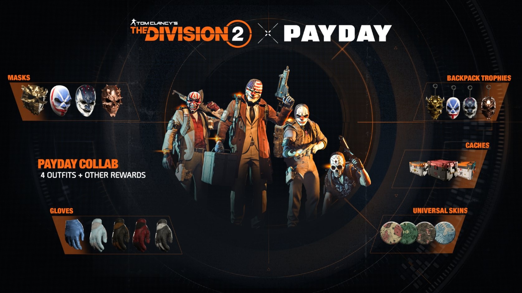 Esta colaboración permite a los jugadores hacerse con cuatro aspectos icónicos de los personajes más conocidos de la PAYDAY Gang: el cerebro criminal Dallas, el veterano combatiente Chains, el exasesino de la yakuza Jiro y el antiguo miembro de un cártel Sangres. Si siempre quisiste patrullar las calles de Washington D.C. con el estilo inconfundible de estos legendarios atracadores, ¡esta es tu oportunidad!
