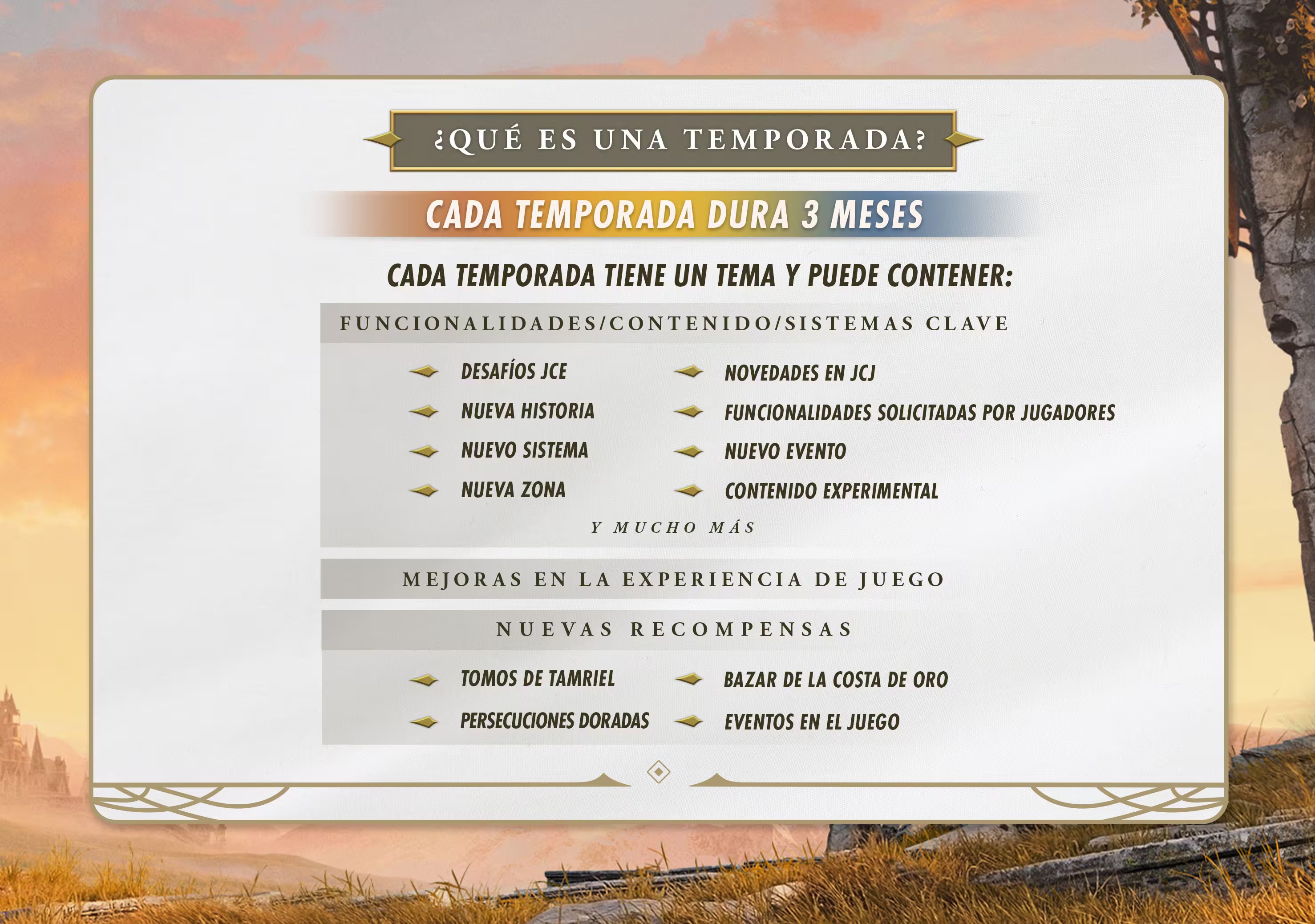 | Temporada 1 | Verano/Otoño 2026 | Nueva línea Gremio de Ladrones, regreso de Sheogorath, nueva Trial |