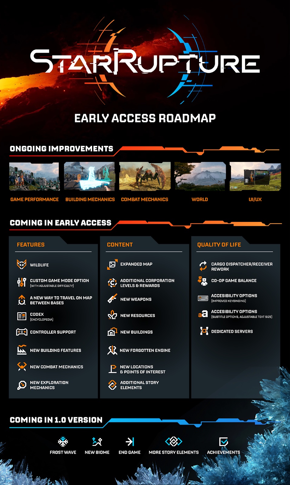 En StarRupture, los jugadores deben explorar el peligroso planeta Arcadia-7, rico en recursos pero azotado por cataclismos constantes provocados por su estrella, Ruptura. El juego combina tres pilares fundamentales: