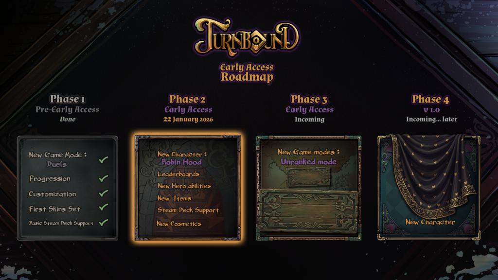 Tras meses de pruebas públicas a través de su demo y el lanzamiento del modo Duelos, el acceso anticipado supone un gran paso adelante para Turnbound. Esta versión introduce la capa competitiva del juego, un nuevo héroe jugable, sistemas ampliados y las bases de un desarrollo a largo plazo construido junto a la comunidad.