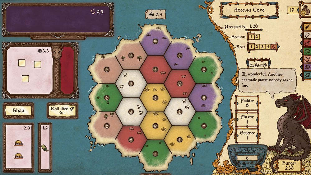 En Feed the Scorchpot, hay que gestionar la economía de una pequeña isla para satisfacer el incombustible apetito de un dragón residente, sabiendo que si se le para de dar de comer, la gente de la isla arderá. Se tendrá que usar más de 20 tipos de dados especializados en conseguir ingredientes y activar la producción de edificios alrededor de un escenario de casillas para mantener al dragón a raya. La supervivencia dependerá de construir un engranaje eficiente de campos de cultivo, santuarios, y además acariciar al dragón de vez en cuando para mantener la paz.