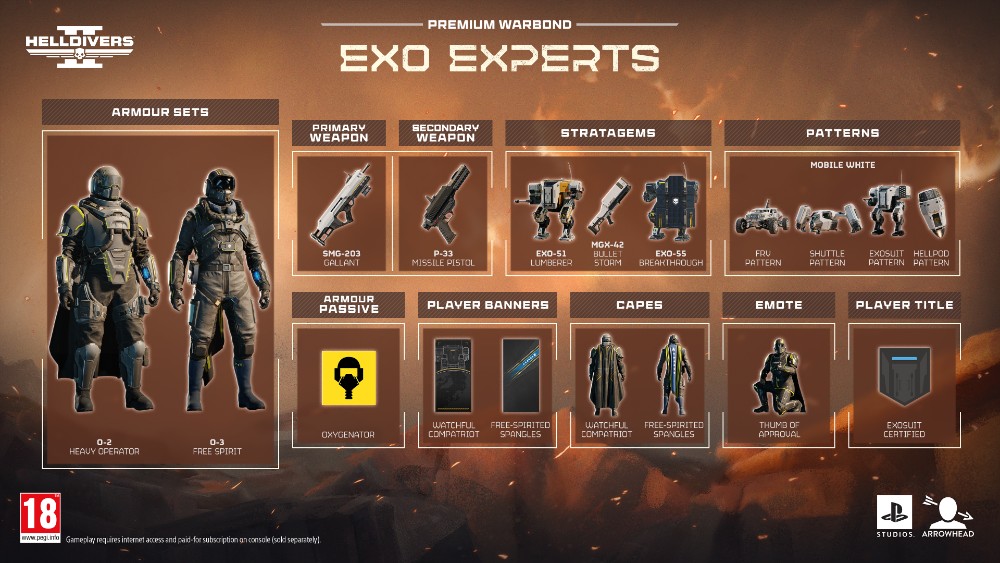 Sony Interactive Entertainment (SIE) anuncia la llegada del nuevo bono de guerra prémium de HELLDIVERS™ 2, Exoexpertos, La lucha por la democracia gestionada alcanza un nuevo nivel de potencia de fuego. El Ministerio de Defensa ha autorizado oficialmente el despliegue del bono de guerra Exoexpertos, una actualización masiva del arsenal de Helldivers 2 que estará disponible a partir de hoy. Esta nueva fase de la guerra galáctica se centra en convertir la tecnología mecánica en la herramienta definitiva para proteger la libertad.